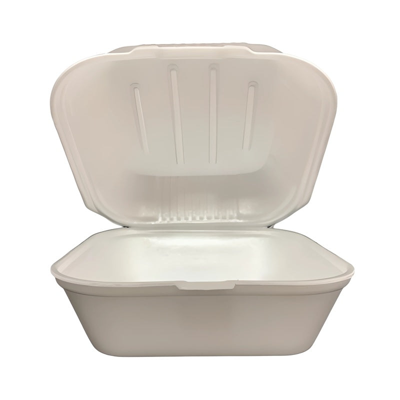 El contenedor térmico para alimentos Reyma en color blanco es ideal para hamburguesas y platillos individuales, ofreciendo una presentación limpia y práctica para negocios de comida, cocinas y servicio para llevar.